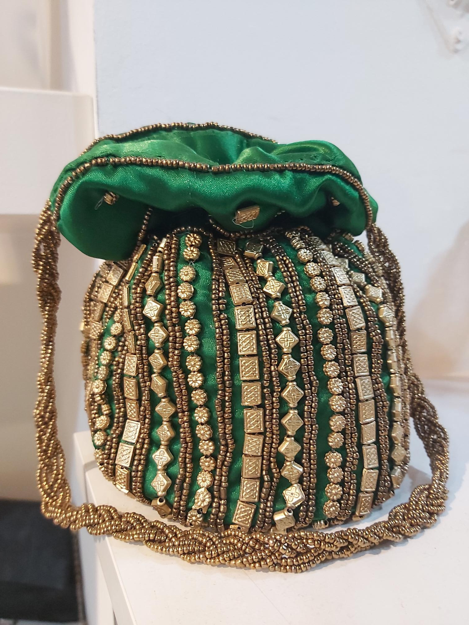 Limosnera en satén verde con tachuelas dorado mate.